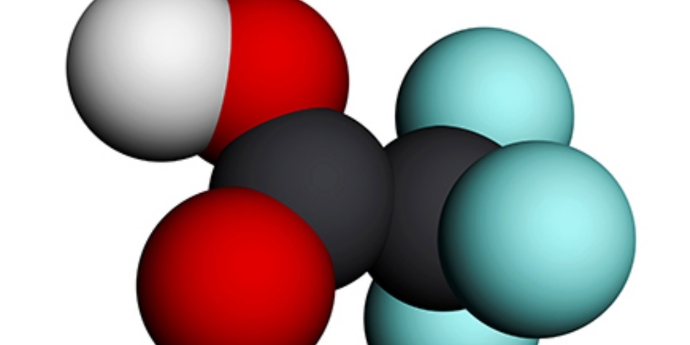 TFA ist das kleinste Molekül der PFAS-Gruppe. (schwarz: Kohlenstoff, rot: Sauerstoff, weiss: Wasserstoff, blau: Fluor) Bild: Adobe Stock